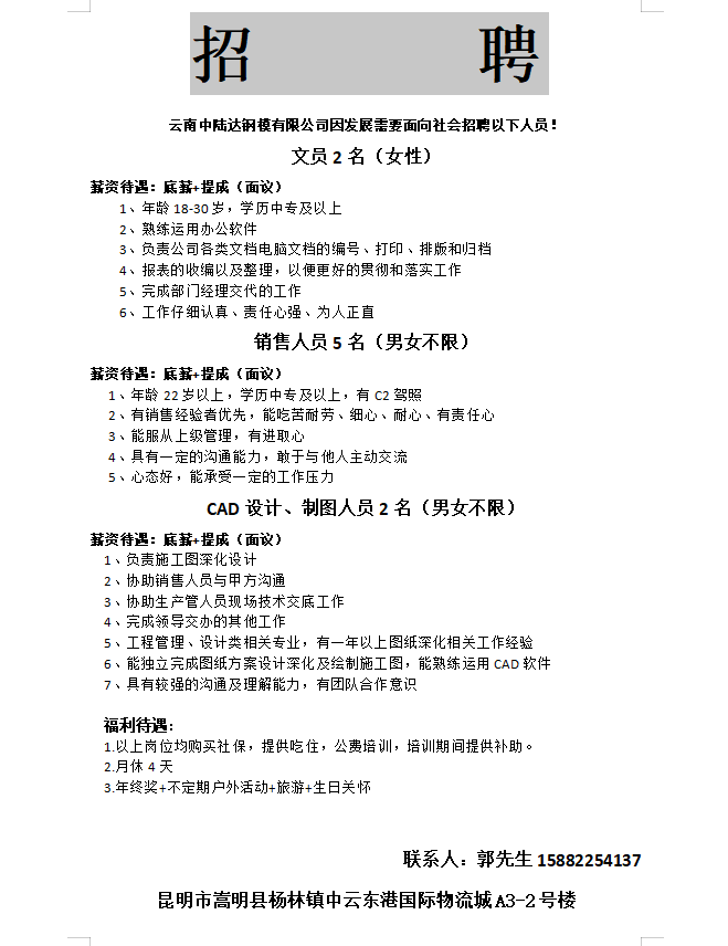 為了我司更好更快的發(fā)展,現(xiàn)向社會(huì)招聘以下幾個(gè)崗位 ,有興趣的 、條件符合的朋友歡迎來(lái)面試!